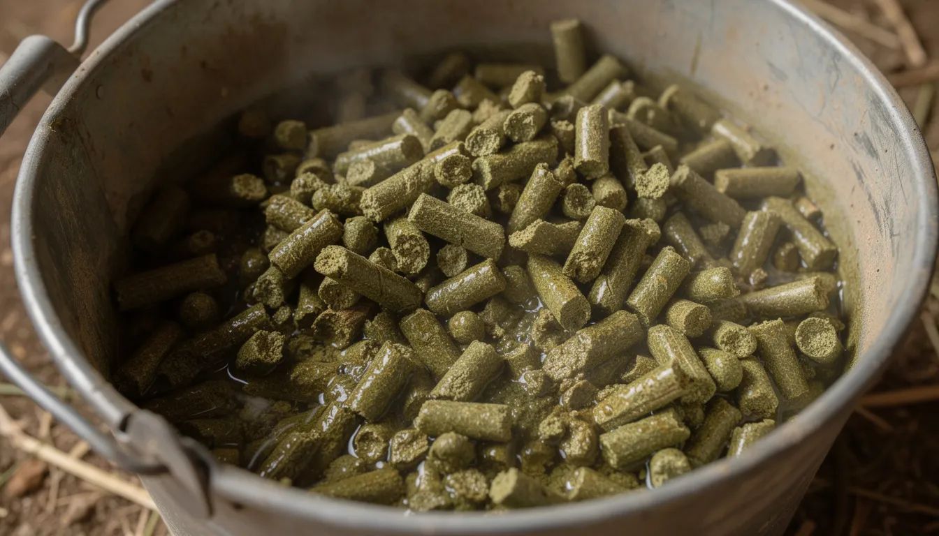 A close-up view of soaking alfalfa pellets in a feed bucket.