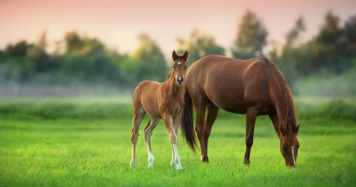 A mare and foal in a lush green pasture.